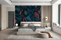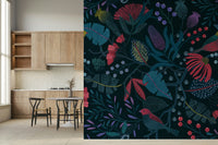 Escape into the enchanting depths of 'Wonderforest,' a captivating wallcovering that brings a touch of whimsical wilderness to your living space. Immerse yourself in a tapestry of stylised flora and fauna, where vivid blossoms and textured leaves intertwine against a rich, twilight-hued backdrop. Discover charming, stylised birds perched amidst branches laden with colourful berries, creating a sense of hidden life and serene harmony. The intricate details and sophisticated colour palette create an atmosphere of both elegance and mystery, transforming any room into a haven of natural beauty. Invite the tranquil allure of a hidden garden into your home, where every glance reveals a new detail within this mesmerizing botanical scene.