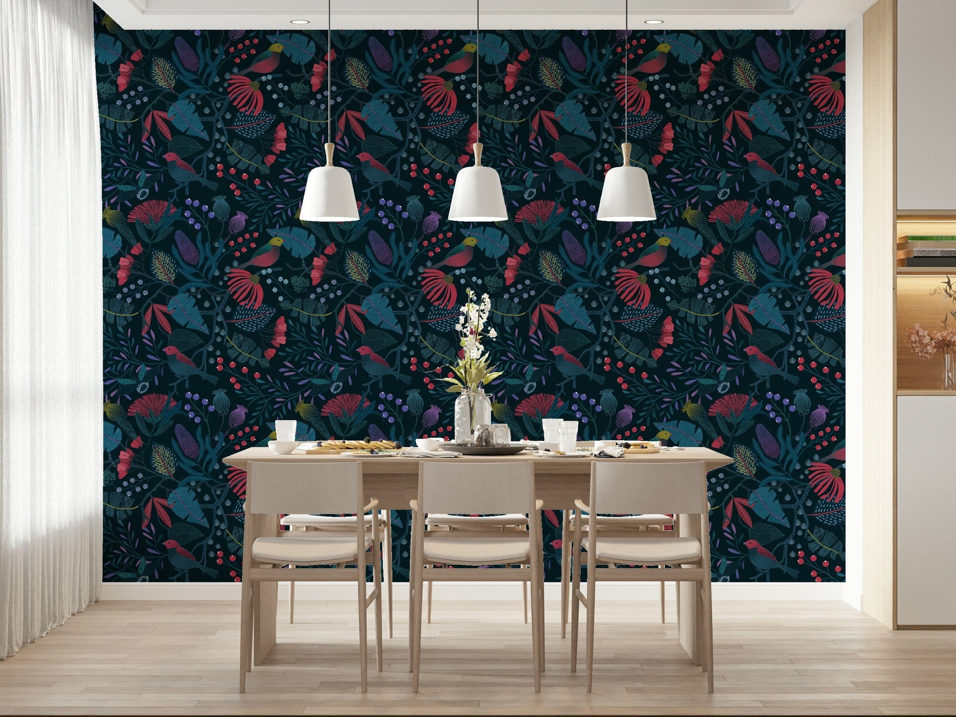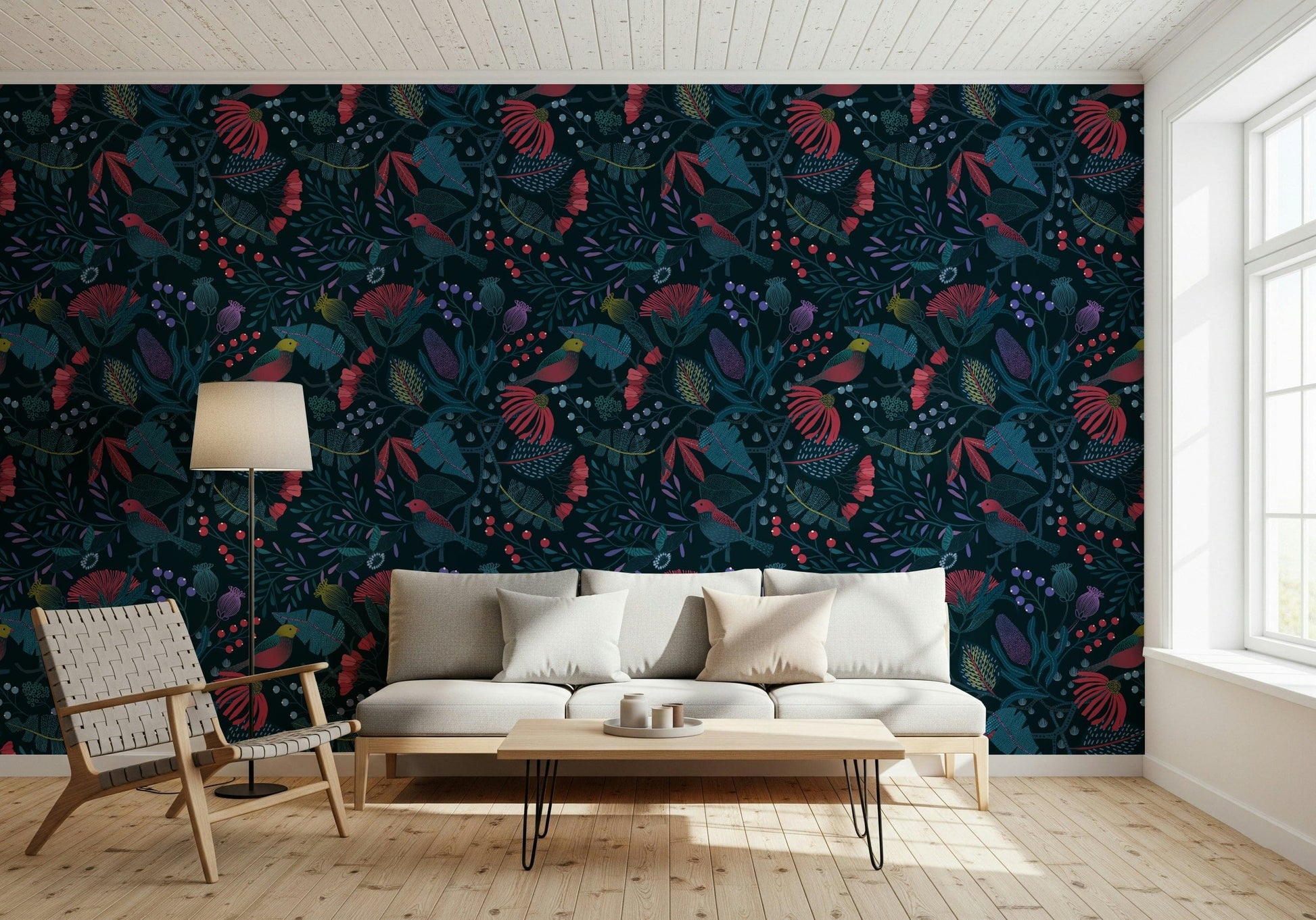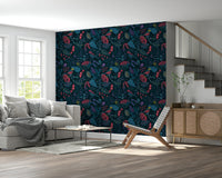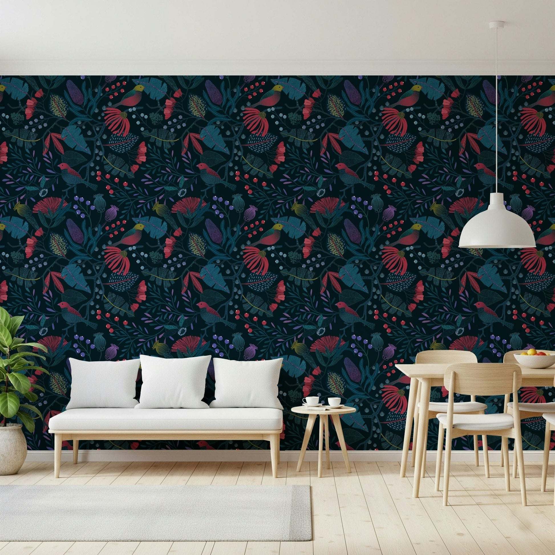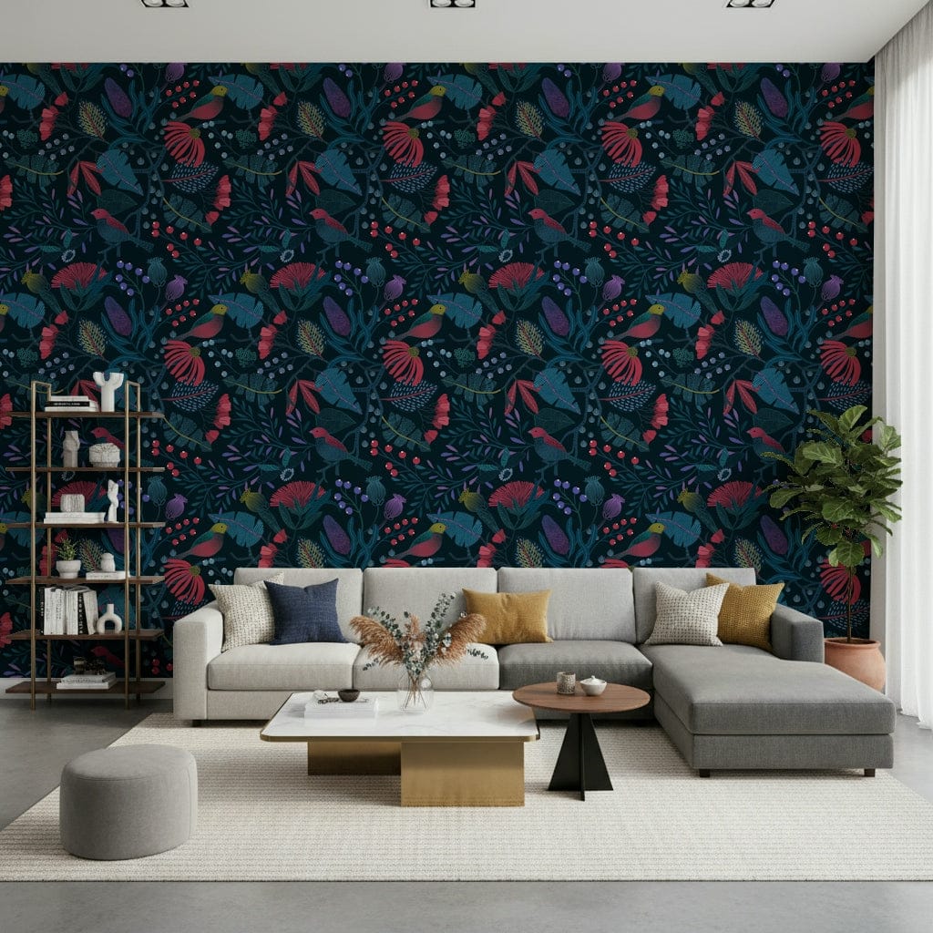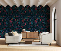 Step into the enchanting world of 'Wonderforest', a captivating wall adornment that brings the magic of a hidden grove to your home. Immerse yourself in a symphony of deep teals and vibrant reds, where stylised flora and fauna intertwine in harmonious patterns. Birds with crimson plumage perch amidst intricate foliage, their presence adding a touch of lively charm to the scene. Unique textures and detailed designs on the leaves and petals create depth and visual interest, inviting you to explore the details of this mystical landscape. The dark backdrop accentuates the rich colours and intricate details, creating a sense of drama and sophistication. 'Wonderforest' transforms any wall into a portal to a whimsical retreat, perfect for creating a calming and imaginative atmosphere in your space. Let the beauty of this stylised wonderland inspire your everyday life.