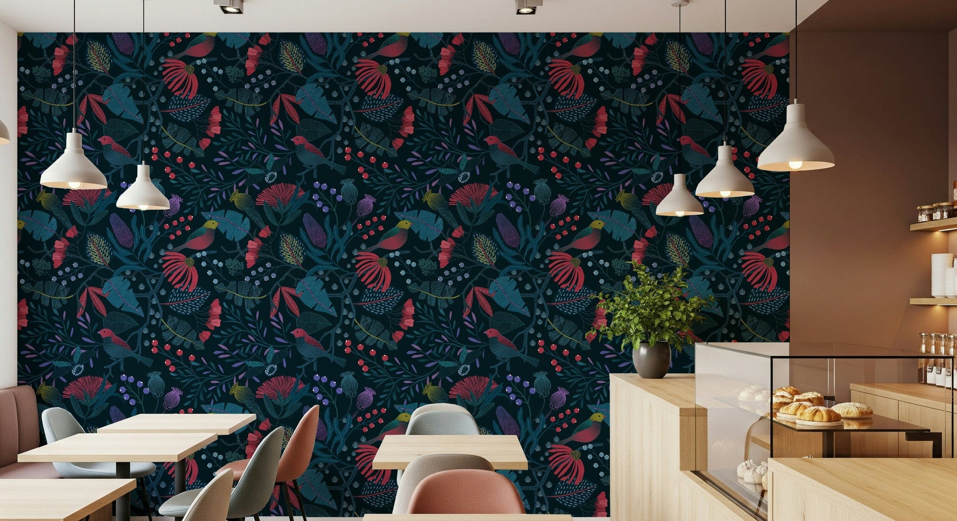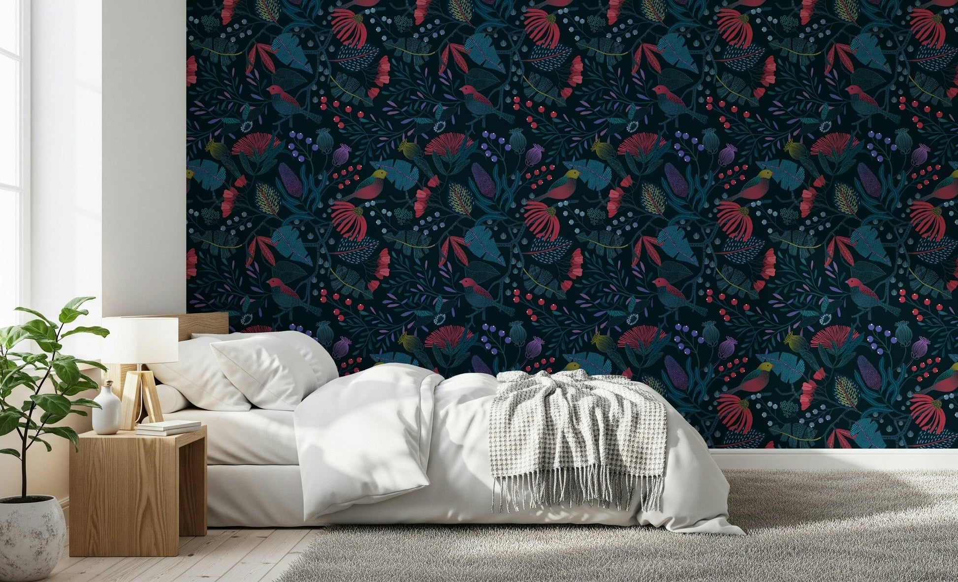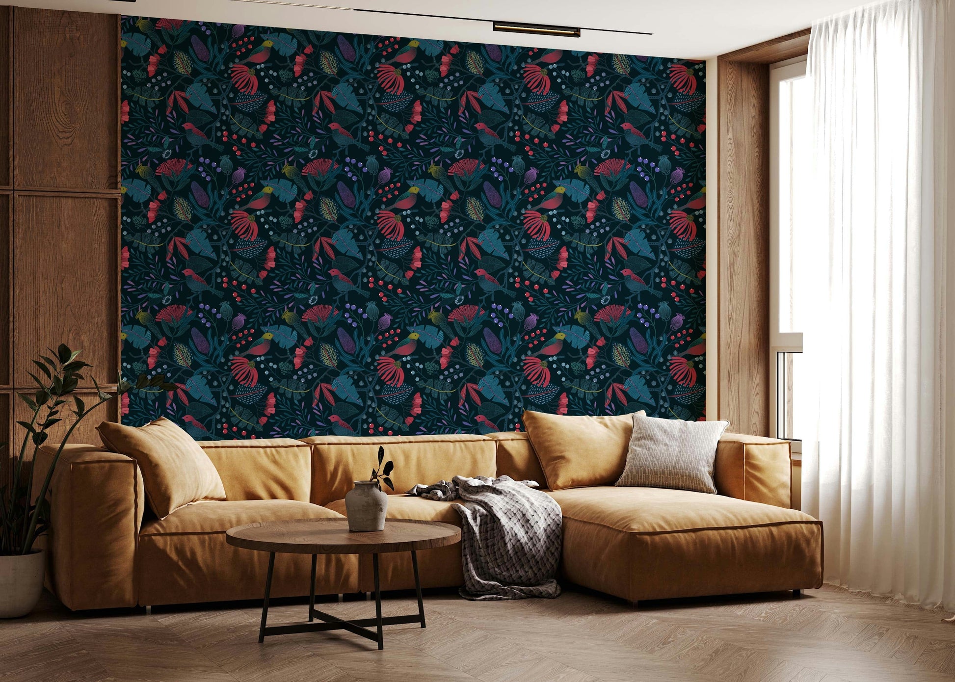 Step into the enchanting world of 'Wonderforest', a captivating wall adornment that brings the magic of a hidden grove to your home. Immerse yourself in a symphony of deep teals and vibrant reds, where stylised flora and fauna intertwine in harmonious patterns. Birds with crimson plumage perch amidst intricate foliage, their presence adding a touch of lively charm to the scene. Unique textures and detailed designs on the leaves and petals create depth and visual interest, inviting you to explore the details of this mystical landscape. The dark backdrop accentuates the rich colours and intricate details, creating a sense of drama and sophistication. 'Wonderforest' transforms any wall into a portal to a whimsical retreat, perfect for creating a calming and imaginative atmosphere in your space. Let the beauty of this stylised wonderland inspire your everyday life.