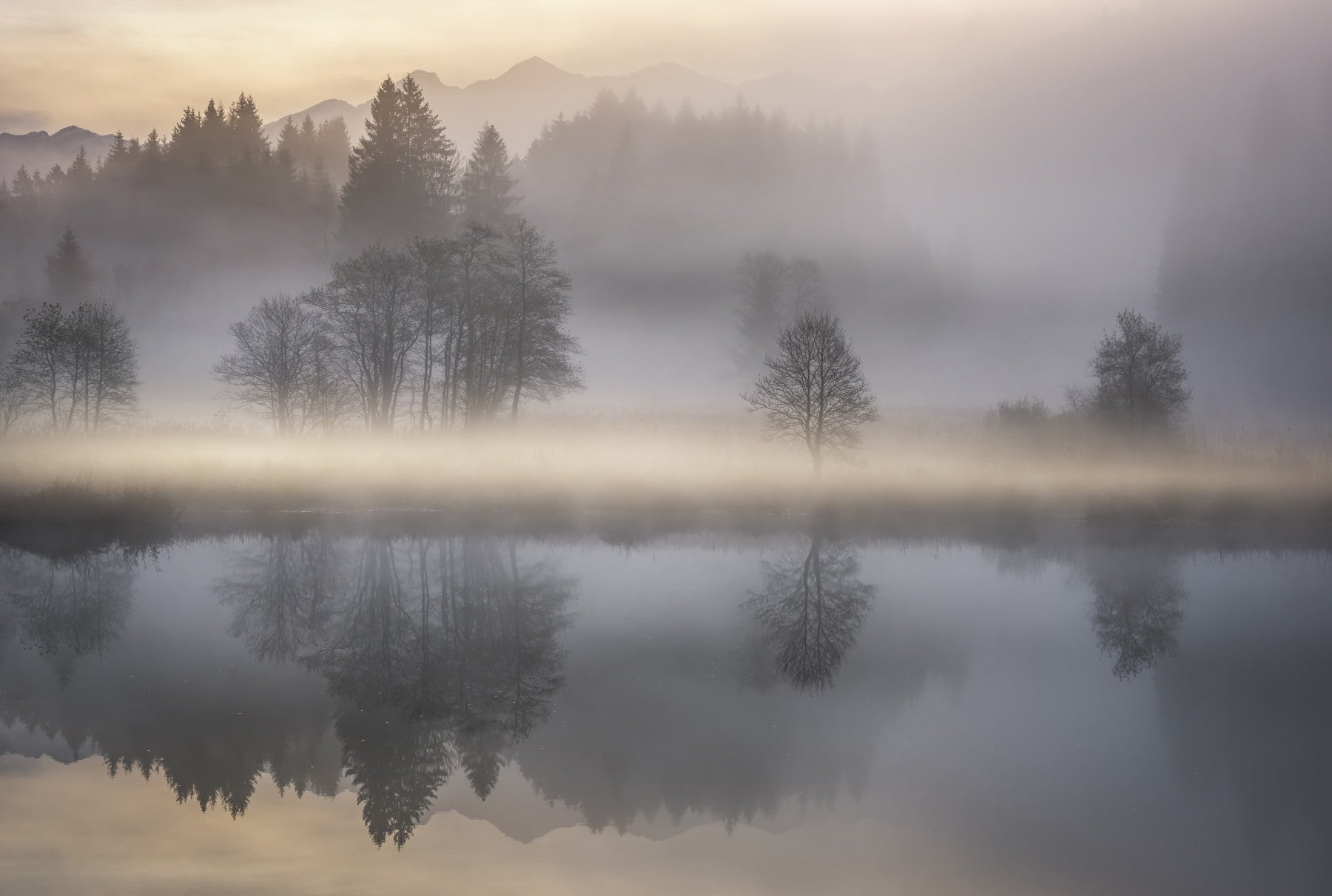 Immerse yourself in the serene beauty of 'Woodland Dawn Reflection.' This captivating wallpaper captures the ethereal stillness of a forest awakening, where the first light of dawn filters through a veil of mist. Silhouetted trees stand sentinel, their forms mirrored flawlessly on the calm surface of a tranquil lake, blurring the line between reality and dream. The muted palette of soft grays, gentle golds, and hazy whites evokes a sense of peace and quietude, inviting you to lose yourself in the tranquility of nature. Distant mountains fade into the misty horizon, adding depth and mystery to this enchanting scene. 'Woodland Dawn Reflection' is more than just a wallpaper; it's a portal to a world of calm, a daily reminder of the simple, restorative power of nature's beauty, perfectly capturing the magical moments when the world slowly awakens.