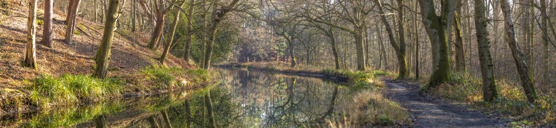 Canal through a forest. Capture the quiet beauty of nature with this stunning wallpaper. It shows a peaceful stream reflecting a bare forest landscape. The muted palette creates a calming effect, perfect for transforming spaces into serene sanctuaries. Use this wallpaper for walls to infuse a sense of tranquility into your living room, bedroom, or study. This design blends seamlessly with various interior styles, from rustic charm to contemporary elegance. The natural imagery brings an organic, relaxing vibe indoors.