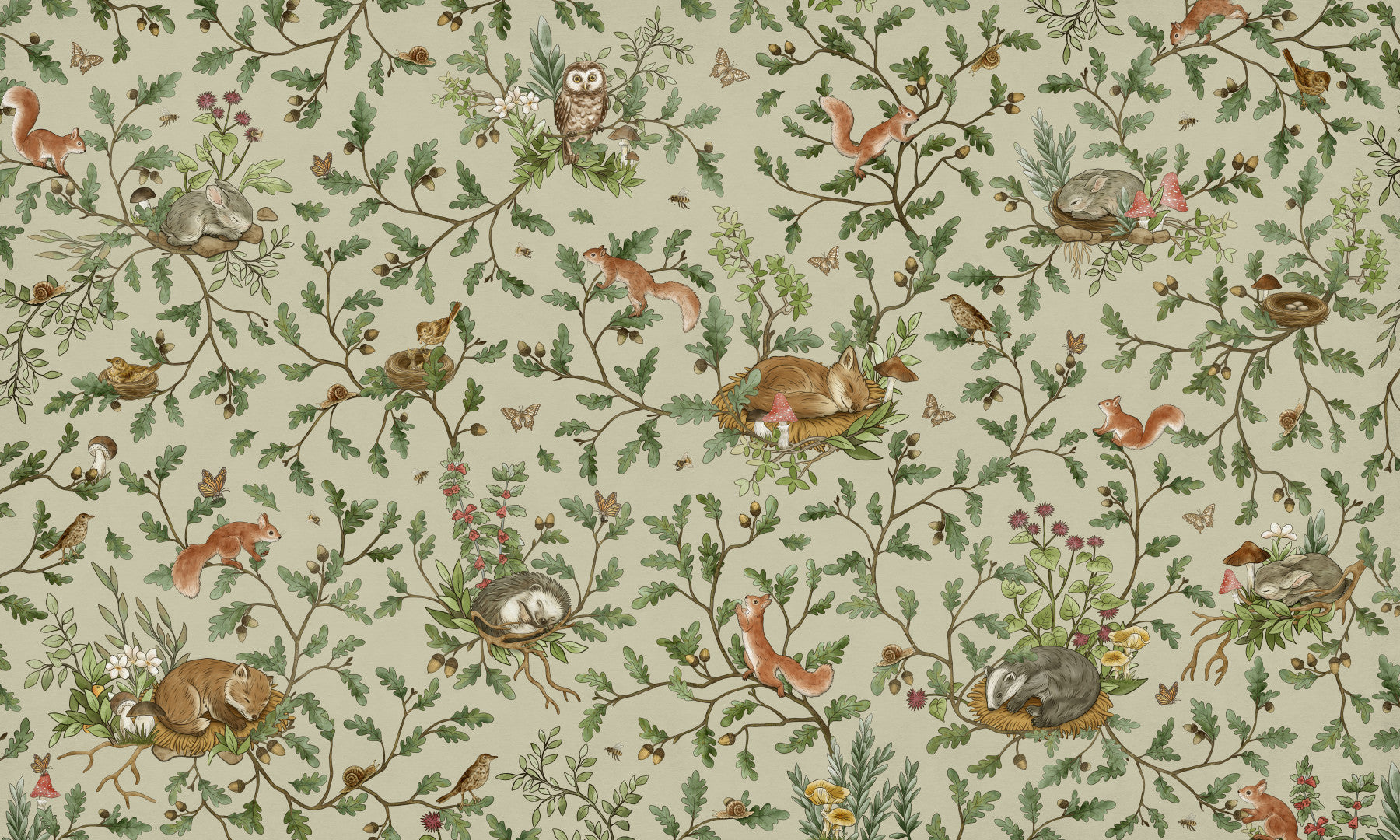 Invite a touch of forest charm into your home with this delightful wallpaper for walls. Softly illustrated forest creatures – squirrels, owls, and rabbits – snooze amongst oak branches and leaves on a serene backdrop. The muted green, beige, and brown tones lend a peaceful, natural feel. This design is perfect for a nursery, bedroom, or any room where you want to cultivate a calm, inviting space. It complements interiors with a nature-inspired elegance.