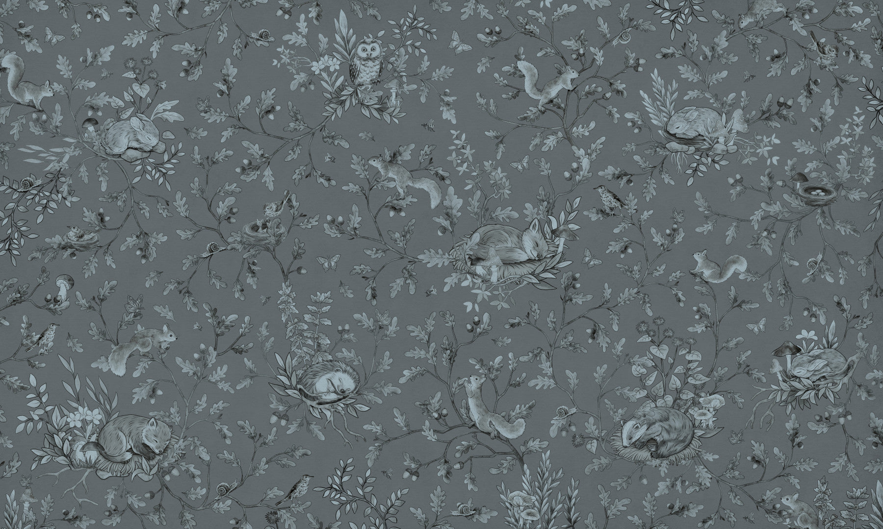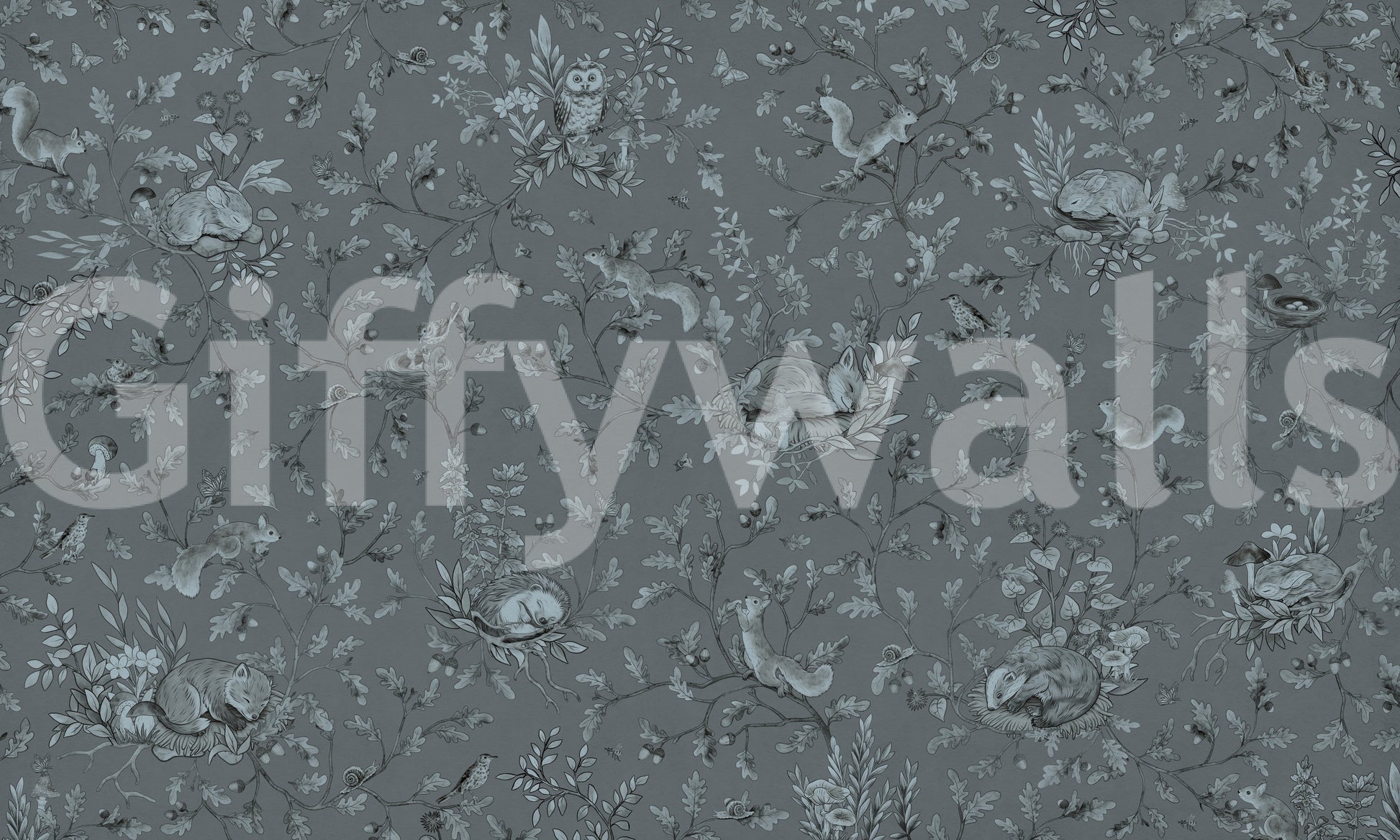 Drift into a peaceful slumber with this calming wallpaper for walls. A collection of forest friends, including foxes, squirrels and hedgehogs, are artfully nestled among branches, flowers and acorns. Rendered in a monochrome palette with shades of grey, this enchanting scene is perfect for creating a relaxing atmosphere in bedrooms, nurseries or reading nooks. The detailed illustrations bring a touch of nature indoors and complement interiors with their subtle charm.