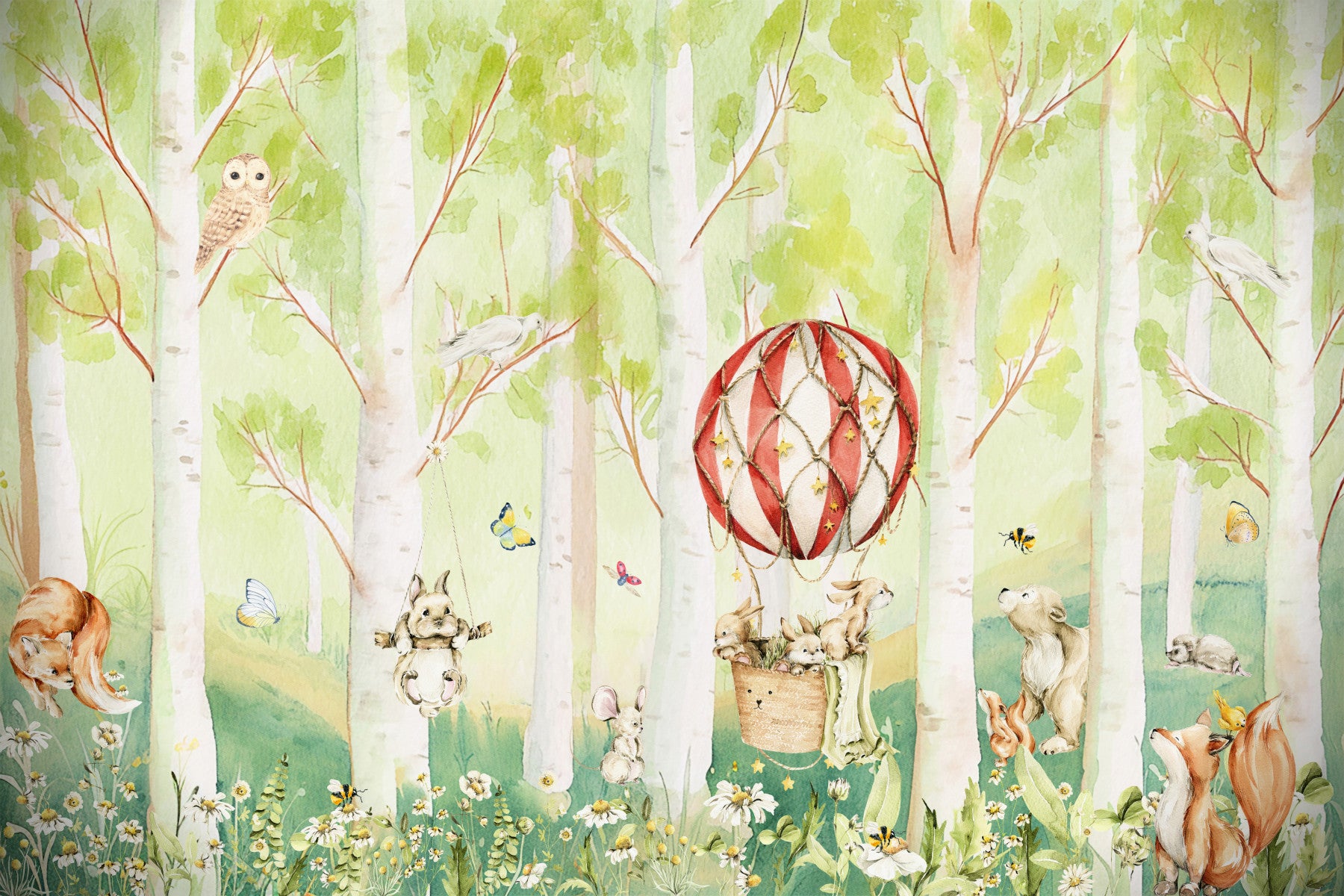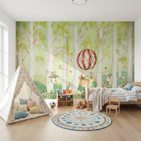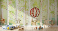 Transform your space with this playful and inviting forest mural. Watercolour birch trees set the stage for a delightful scene filled with charming animals. The vibrant red and white hot air balloon steals the spotlight. Gentle green and beige tones add a soothing element. This wallpaper for walls creates an enchanting backdrop in a nursery, child’s bedroom, or playroom. It enhances the room with cheerful energy and a sense of adventure. The detailed brushstrokes and endearing characters make any interior feel welcoming and imaginative.