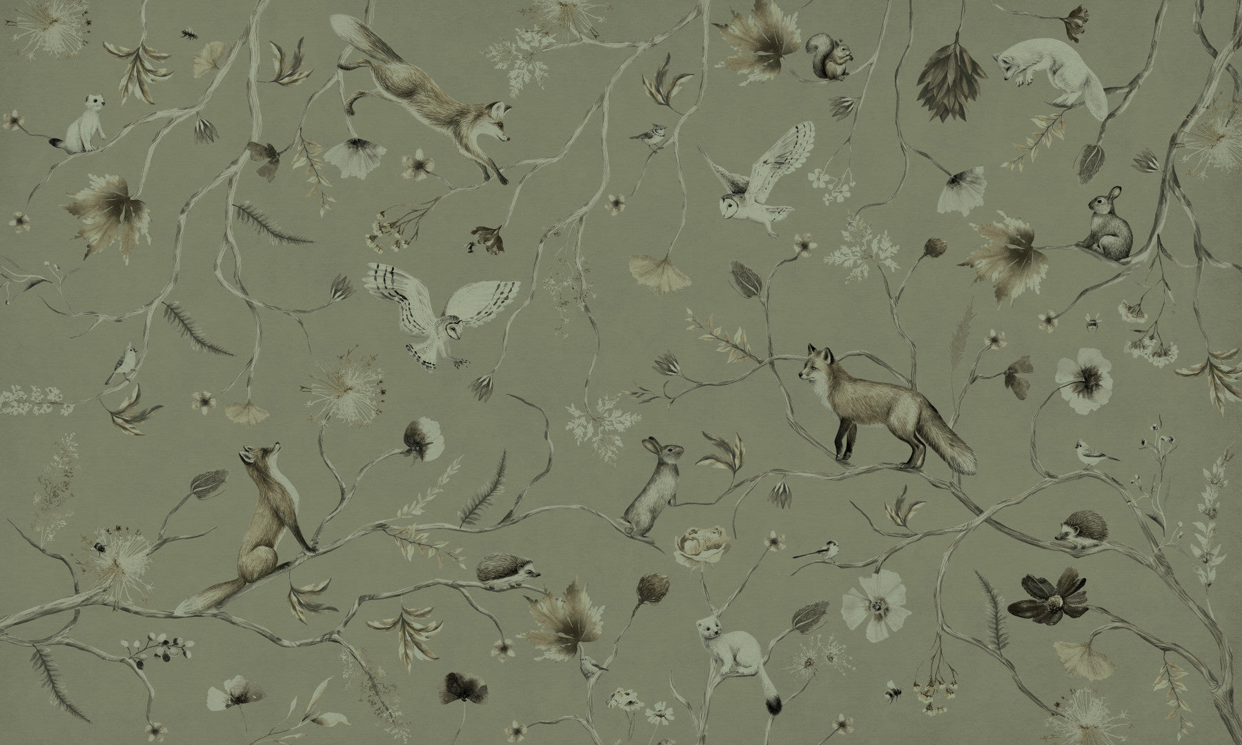 Bring a touch of the outdoors inside with this lovely wallpaper for walls. The design features sketches of forest animals such as foxes and owls on tree branches, all set against a soothing sage background. It is well suited for living rooms, bedrooms, or nurseries, and the peaceful design enhances many interior styles. Soft tones and gentle imagery promote a tranquil atmosphere. The pattern is perfect with rustic decor and provides a cosy feel, turning any room into a calm retreat.