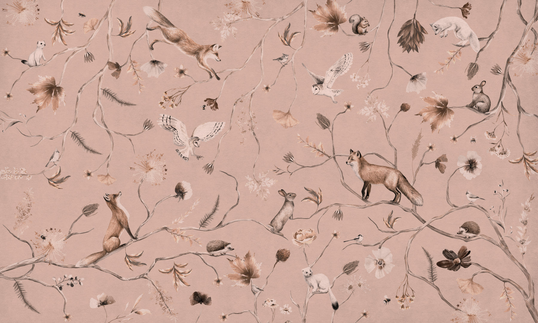 Bring the charm of the forest indoors with this delicate wallpaper. It features detailed illustrations of woodland creatures nestled amongst branches and flowers. The gentle colour palette in soft pinks and browns creates a calm atmosphere. This wallpaper for walls enhances nurseries, bedrooms, and living spaces, adding a touch of nature-inspired beauty. It also blends beautifully with rustic, classic, or bohemian interiors.