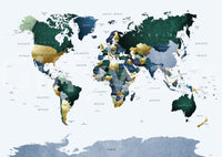 A stunning world map wallpaper in elegant green and blue hues, accented with gold detailing. The textured effect adds depth and sophistication, creating a luxurious feel. Each country is subtly highlighted, making this a sophisticated and informative piece that's perfect for adding a touch of worldly charm to any space. The color palette evokes a sense of calm and global unity, making it ideal for home offices, studies, or anywhere you desire a calming yet stylish backdrop. This high-resolution image offers crisp details and vibrant color, ensuring a captivating visual experience.
