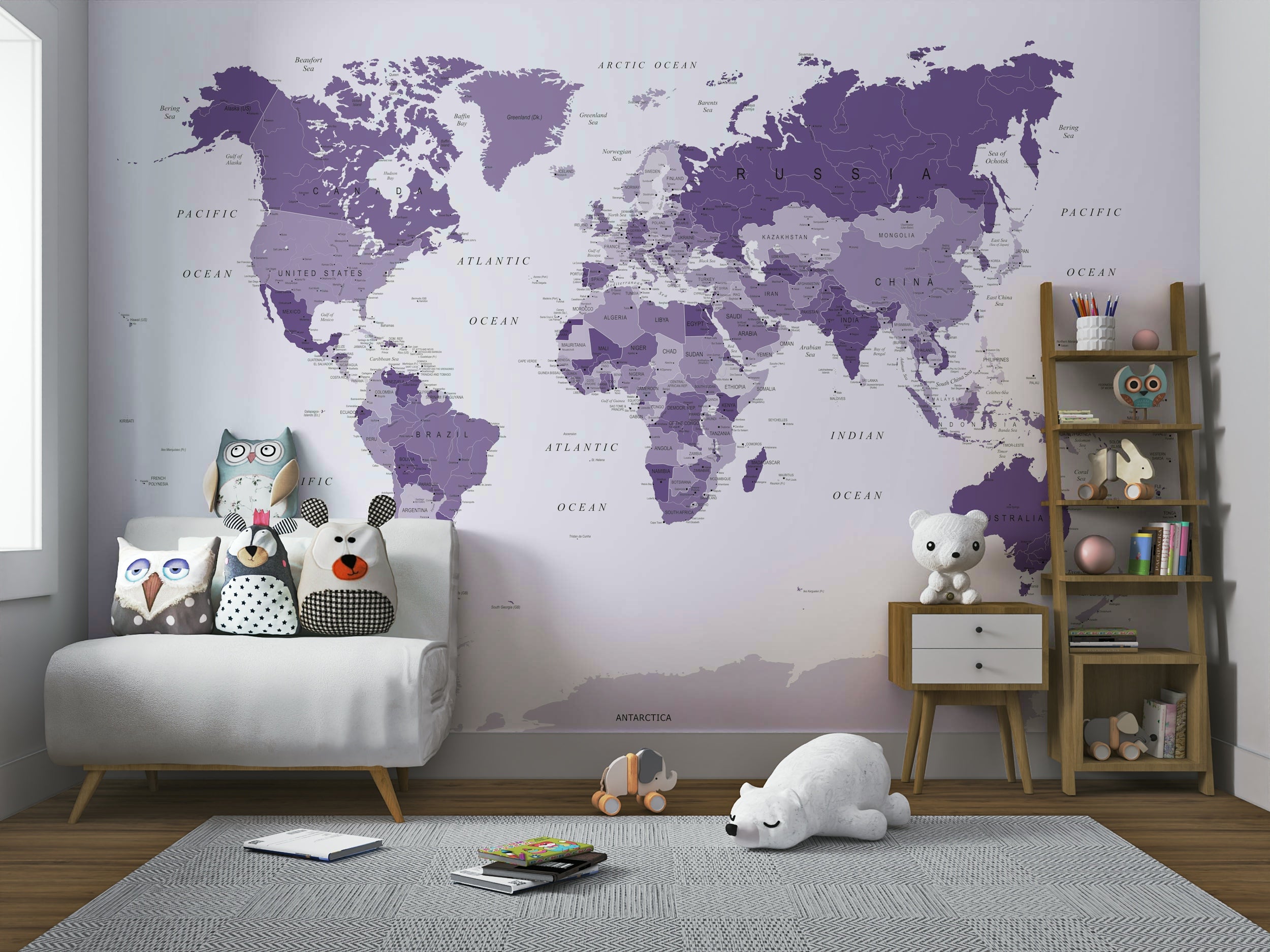A captivating world map rendered in a sophisticated purple hue. This wallpaper offers a unique and elegant aesthetic, showcasing detailed country borders and major cities in a subtly textured, muted purple palette against a clean white background. The calming color scheme and clear cartography create a visually appealing and peaceful atmosphere, perfect for a study, office, or any space needing a touch of sophisticated style. A refined and modern take on a classic world map design.