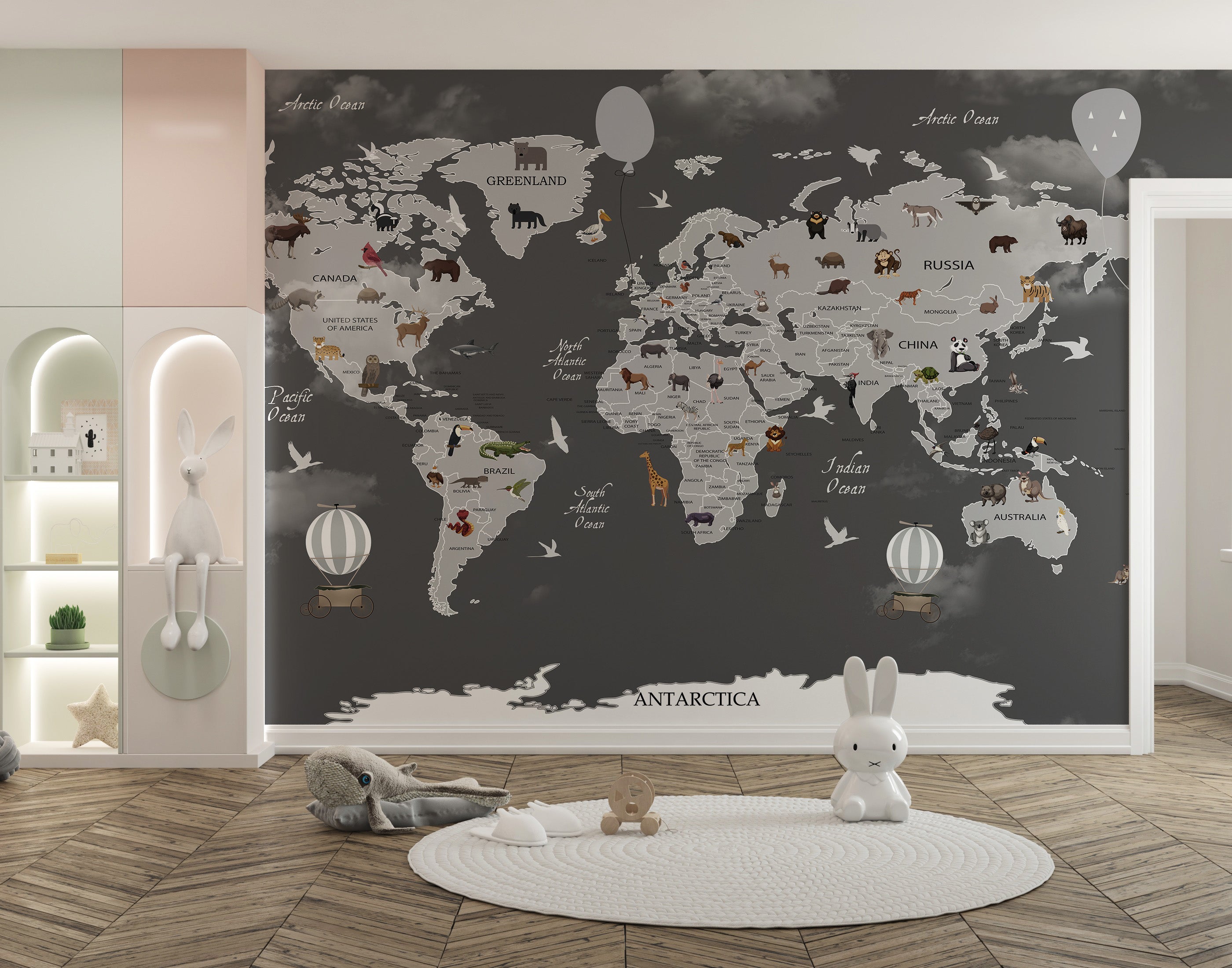 Embark on a global adventure right from the comfort of your child's room with our World Map Kids Room Wallpaper. This vibrant and educational peel and stick wallpaper is a treasure trove of exploration, showcasing a colorful world map teeming with adorable animals representing each continent. It's not just decor; it's a launchpad for curiosity and learning about diverse cultures and the wonders of our planet.