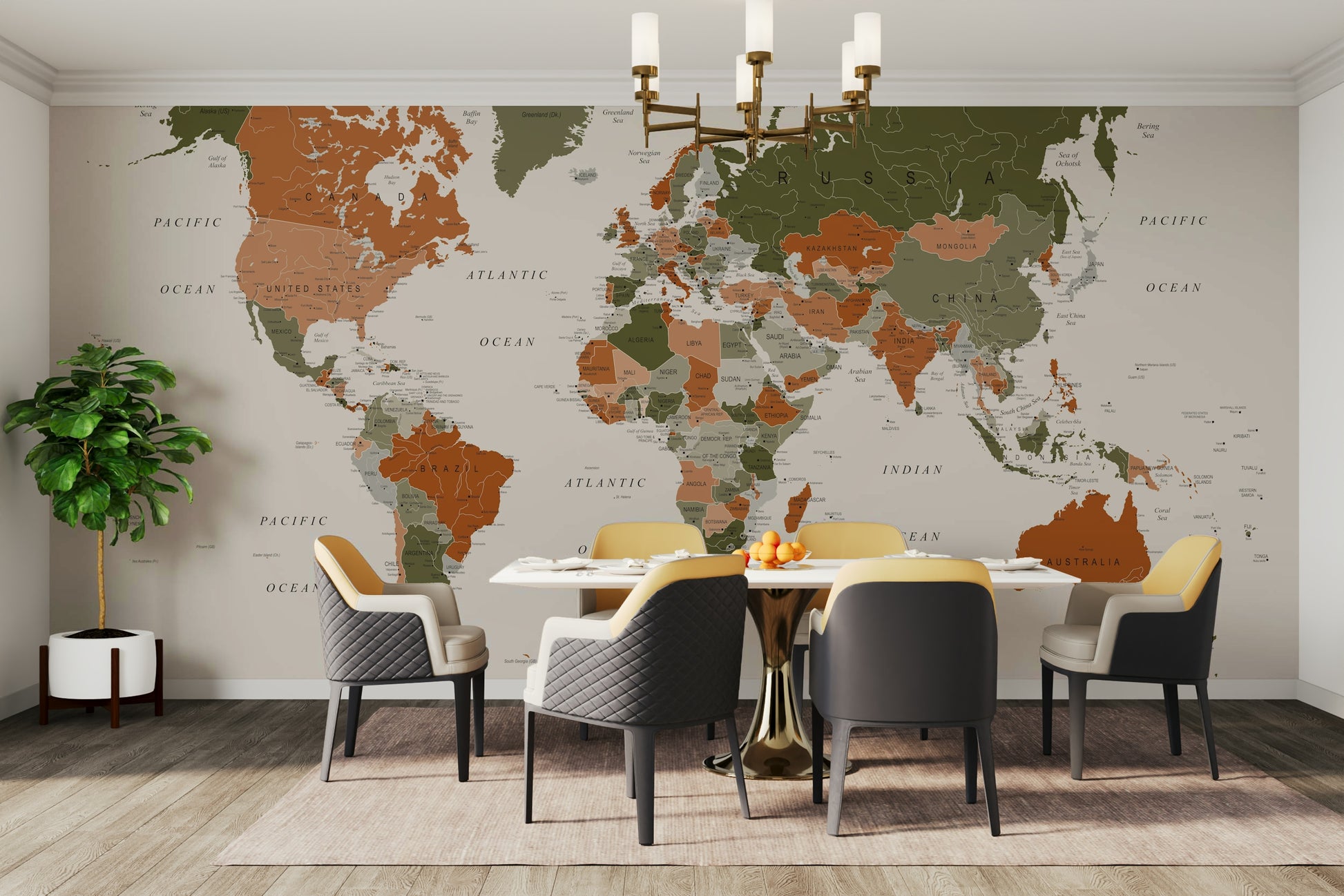 Explore the globe with this captivating olive green world map wallpaper. The muted tones of olive green and earthy brown create a sophisticated and calming aesthetic, highlighting the continents in a subtle yet detailed way. Each country is clearly defined, making it both visually appealing and informative. Perfect for adding a touch of understated elegance and global awareness to your digital workspace or personal devices. This detailed map offers a unique blend of vintage cartography and modern design, fostering a sense of worldly exploration and calm contemplation.
