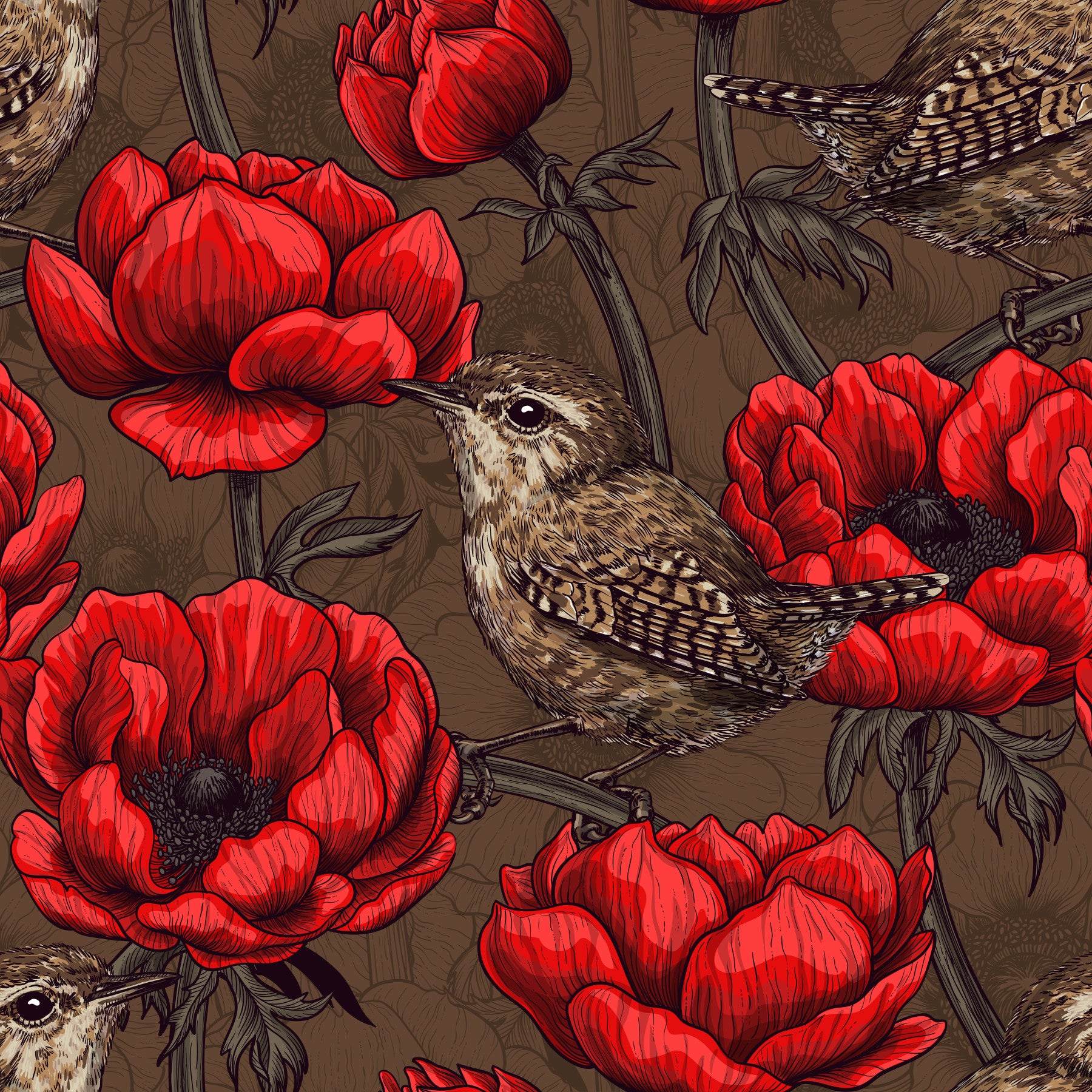 Style your space with Wrens in a Red Anemone Garden Wallpaper, featuring detailed wren birds surrounded by bold red anemone flowers set against a deep brown background. The contrast between the vivid red petals and darker base creates a defined and structured look without making the surface feel crowded. This wallpaper works well in a living room, bedroom, hallway, dining room, or office room where a nature-inspired and visually strong pattern is preferred. The fine line detailing adds clarity and keeps the design organized across large surfaces. Wrens in a Red Anemone Garden Wallpaper pairs easily with wooden finishes, neutral furniture, and modern decor, making it suitable for apartments. Its floral and bird composition offers a practical wall decor solution with a balanced and clear visual identity.