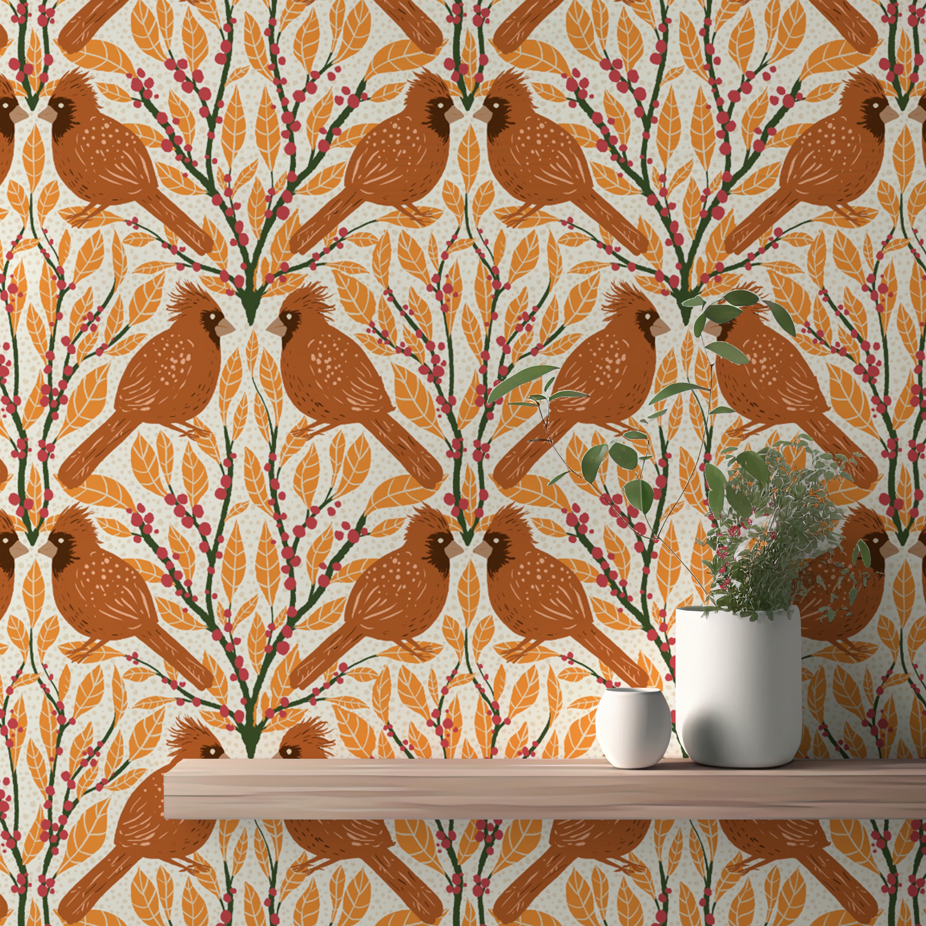 Nature-inspired yellow cardinals wallpaper for cozy living spaces.