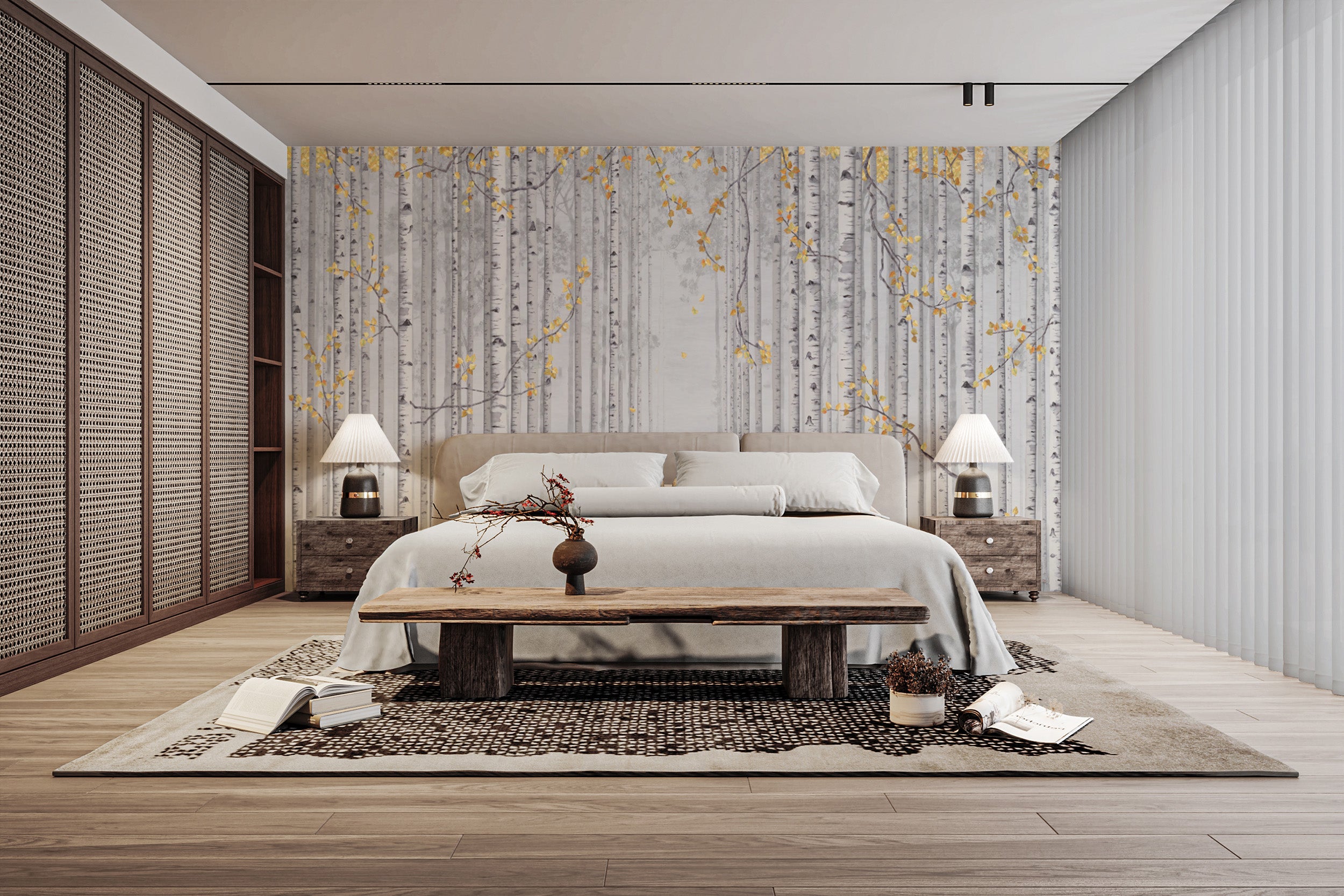 It is introducing the yellow leaves and gray birch trees mural wallpaper – a captivating blend of nature's elegance ideal for any contemporary living room. This forest tree wallpaper showcases a mesmerizing dance of yellow leaves amidst graceful Gray birch trees, creating an ambience of serene beauty. If you're looking for a unique blend of yellow and grey color wallpaper that brings the charm of the outdoors in, this is a perfect choice. Elevate your space with this tree wallpaper, seamlessly blending natural aesthetics with modern design. Experience the tranquillity of nature every day with our Yellow Leaves and Gray Birch Trees Mural Wallpaper.
