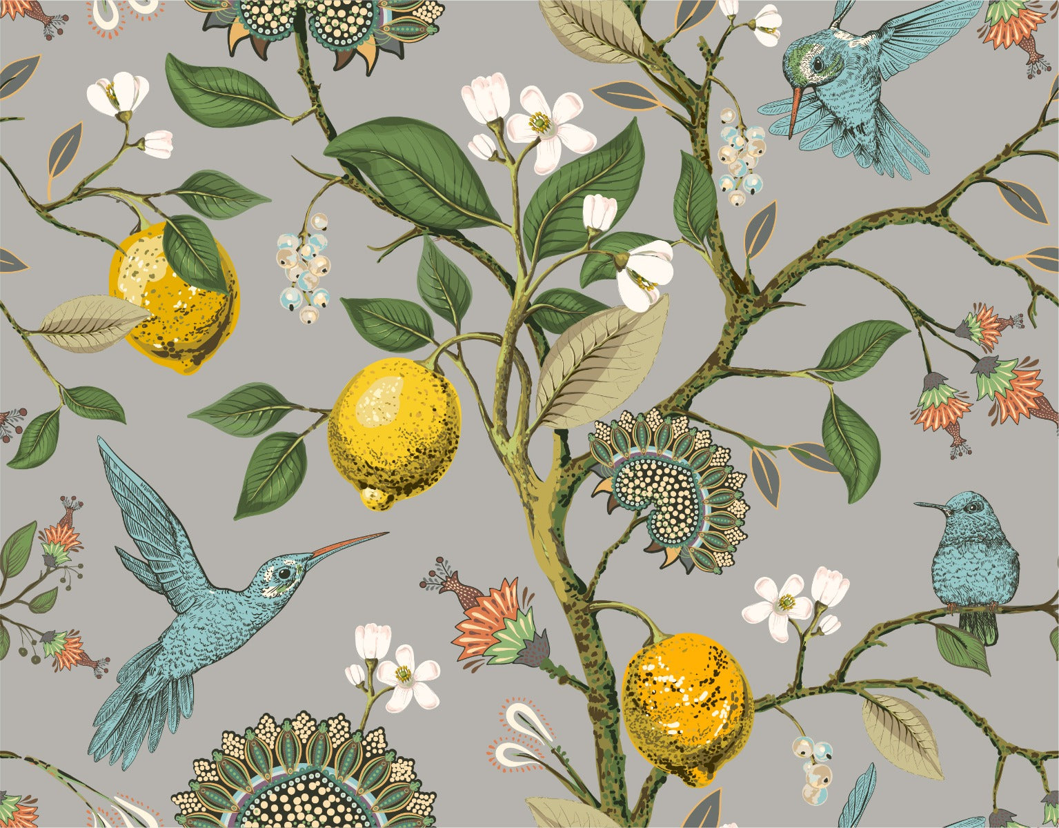 Lemon Tree & Blue Birds Wallpaper offers a refreshing touch to your living space, infusing it with the vibrancy of nature. This wallpaper features a striking depiction of a lemon tree, alive with the zest of its citrus fruits, set against a backdrop teeming with blue birds. These meticulously crafted watercolor bird murals, including enchanting hummingbirds, add a dynamic and refreshing element to your home. Ideal for the living room, this wallpaper transforms your space into a lively, nature-inspired haven.