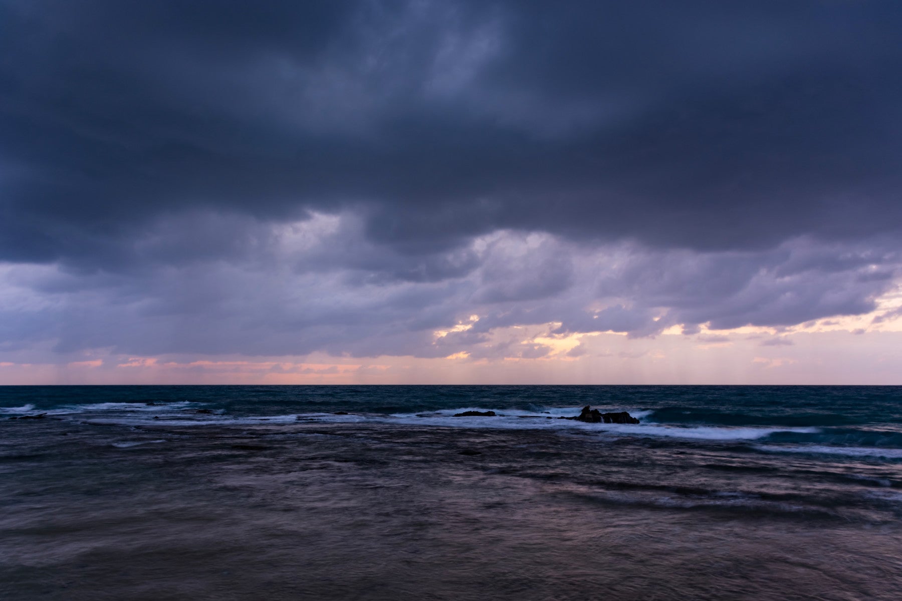Yoreh IV captures a dramatic seascape under a brooding sky, evoking a sense of raw power and untamed beauty. Dominating the scene is a heavy blanket of indigo and violet-tinged clouds, pregnant with the promise of a storm. Glimmers of pale rose and gold paint the horizon, a subtle counterpoint to the looming darkness above, creating an ethereal contrast. The restless sea mirrors the tumultuous sky, its dark teal waters churning and crashing against unseen rocks just beneath the surface. This image, the fourth in the Yoreh series, encapsulates the moment before the storm breaks, a pregnant pause filled with palpable energy and the anticipation of nature's unleashed fury. Let Yoreh IV bring a touch of the sublime to your digital world.