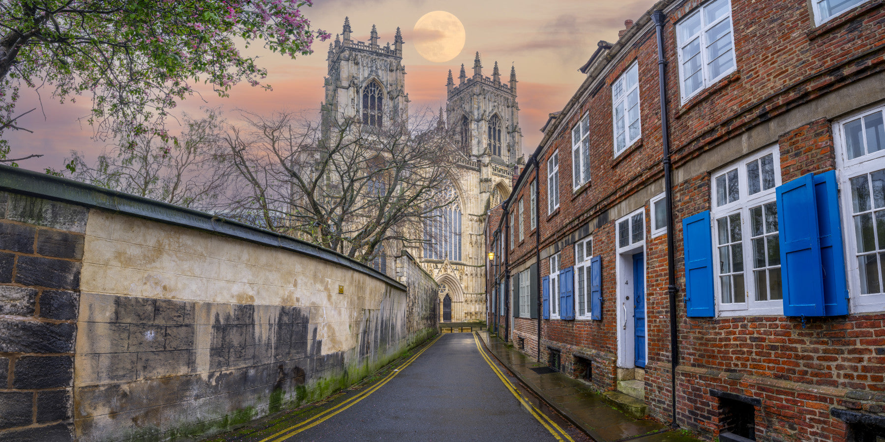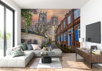 Road through old buildings in York leading to York Minster. Capture the serene beauty of York with this stunning wallpaper. A full moon casts its gentle glow over the historic York Minster and the charming brick buildings lining the street. The image highlights architectural details and the contrast of warm and cool tones. This wallpaper for walls adds a touch of classic elegance to living rooms, bedrooms, or hallways. Let it transform your space with its timeless appeal.