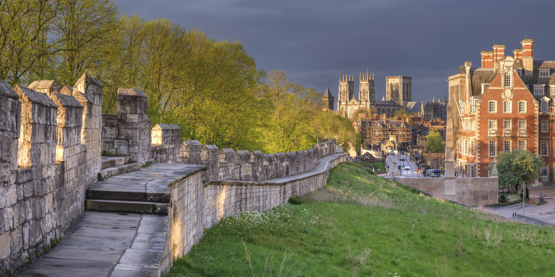 Yorkshire cityscape with busy street and York Minster under overcast sky. Introduce a touch of timeless grandeur to your interiors. This scenic image captures the iconic York city walls under a dramatic sky. The aged stonework contrasts beautifully with the fresh green grass, highlighting the rich history of the location. Apply this wallpaper for walls in your study, living room, or even a grand entryway. The historical essence provides a sophisticated style. It brings depth and creates a remarkable focal point, ideal for those who appreciate heritage and elegance.
