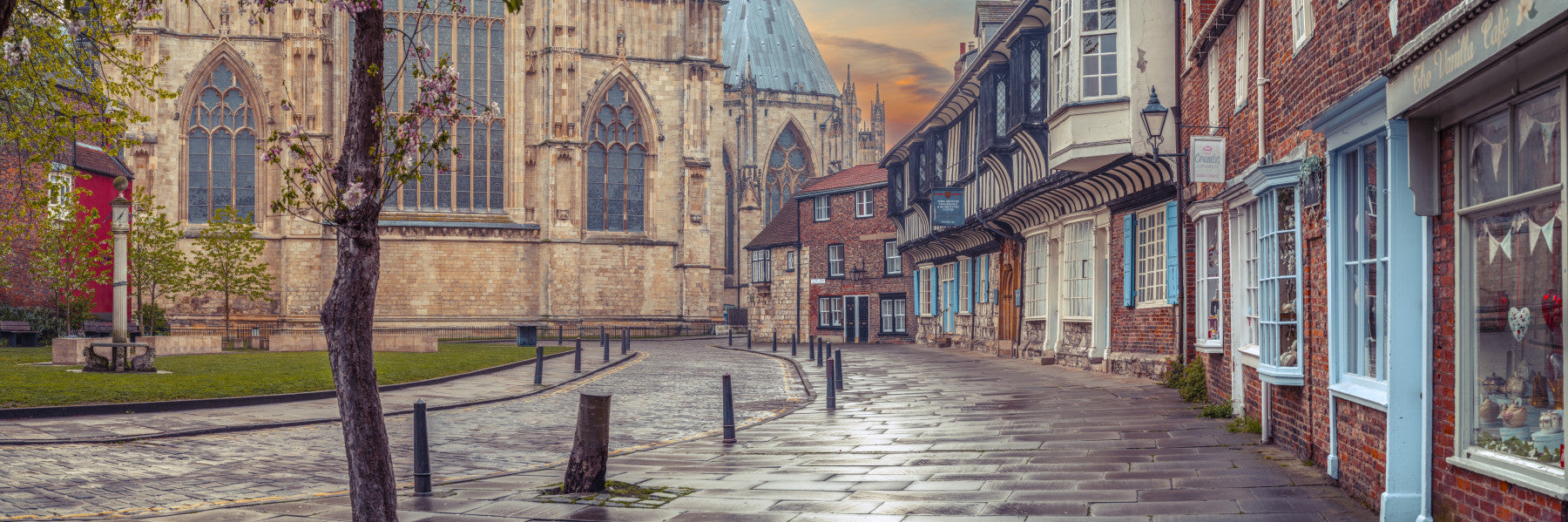 Old Streets of York. Capture the charm of historic York with this street scene. The red brick buildings, the grand cathedral, and blossoming trees create a scene of timeless elegance. This wallpaper for walls brings architectural interest and a touch of European flair to your home. The mixture of neutral tones and pops of blue makes it suitable for living rooms, hallways, or any space where you want to add a touch of sophistication and history. Its classic appeal complements both modern and traditional interiors.