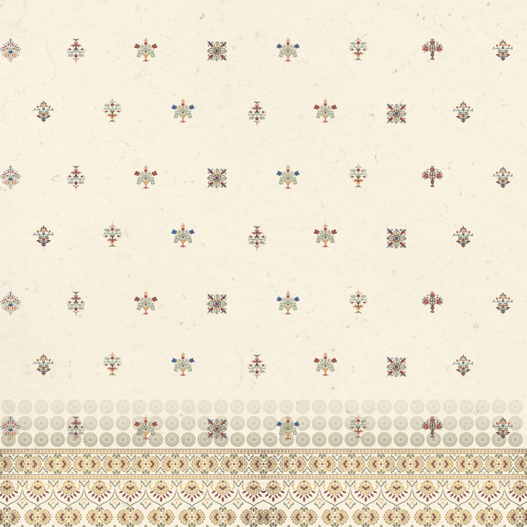 Immerse yourself in the timeless allure of 'Zardozi,' a wallpaper that echoes the grandeur of ancient artistry. This design pays homage to the exquisite embroidery technique of the same name, showcasing delicate floral motifs meticulously arranged against a subtly textured, antique-white backdrop. Each element, from the miniature botanical arrangements to the intricate border detailing at the bottom, reflects the precision and opulence synonymous with Zardozi craftsmanship. The wallpaper is designed with neutral and earthy tones such as gold, beige and maroon. The detailed border brings the bottom of the wallpaper with floral and foliage arrangement on top of a circle pattern. Perfect for adding a touch of understated elegance to any space, 'Zardozi' brings a sense of history and sophistication to your walls. Let your space breathe with the essence of royal craftsmanship, creating an ambiance that is both refined and inviting.