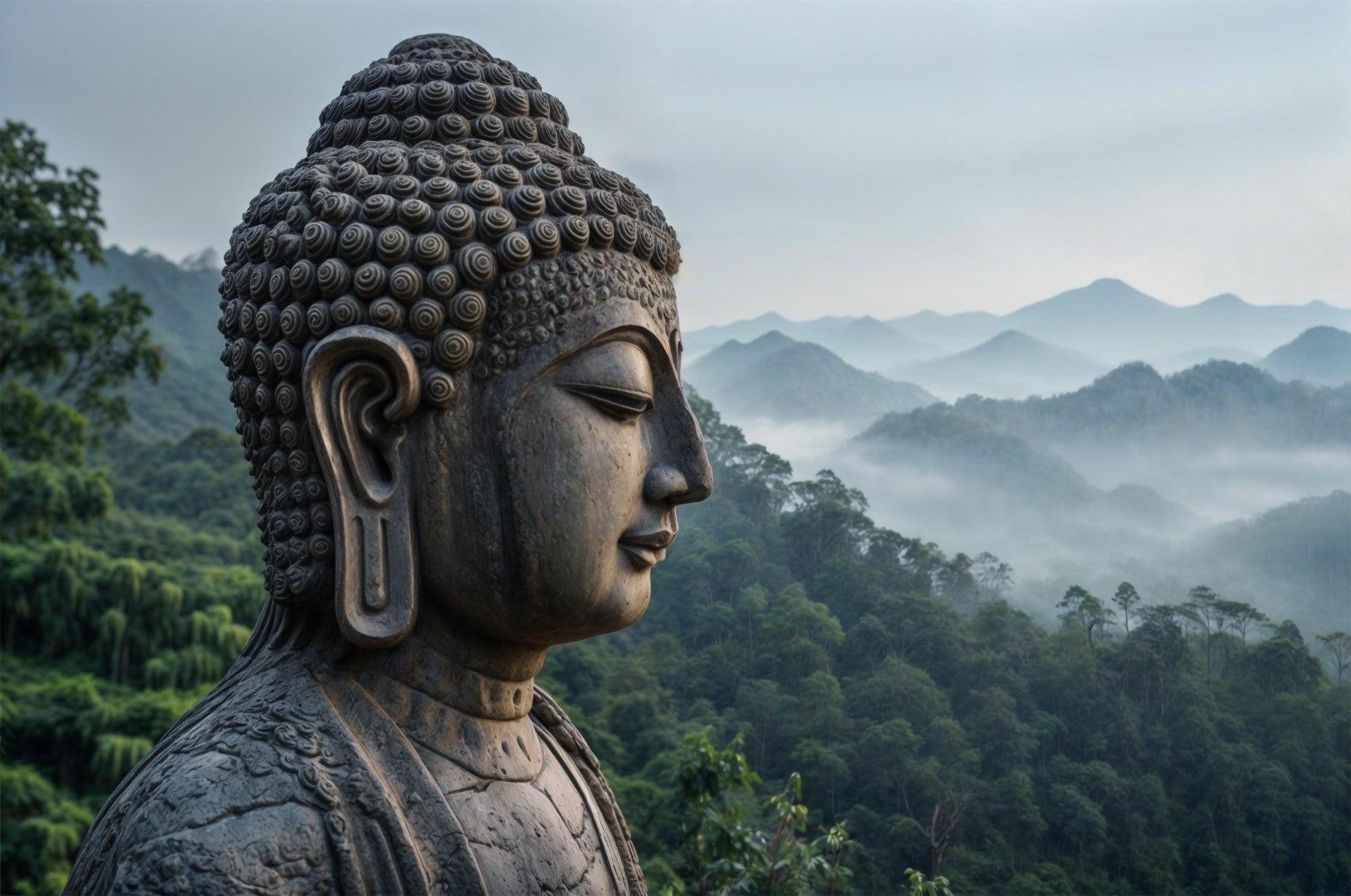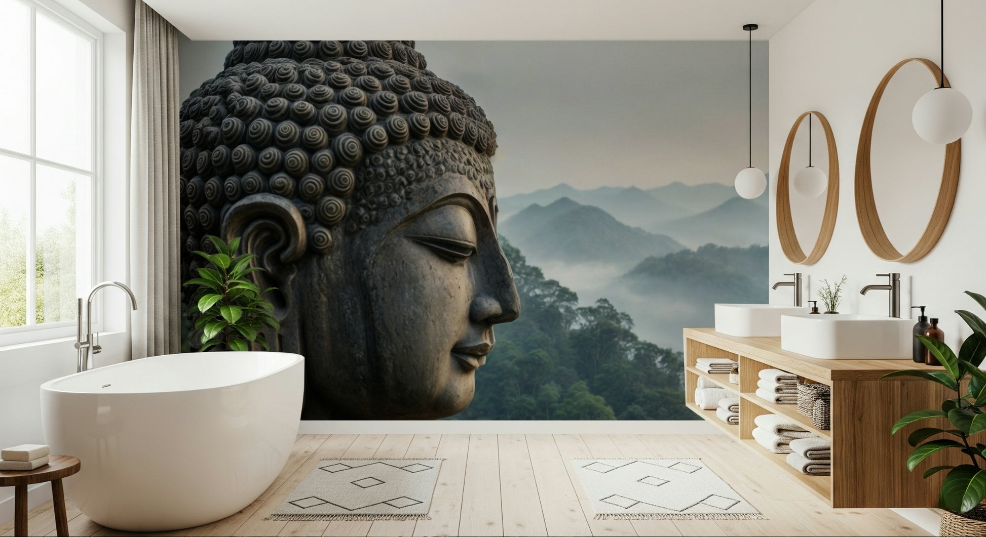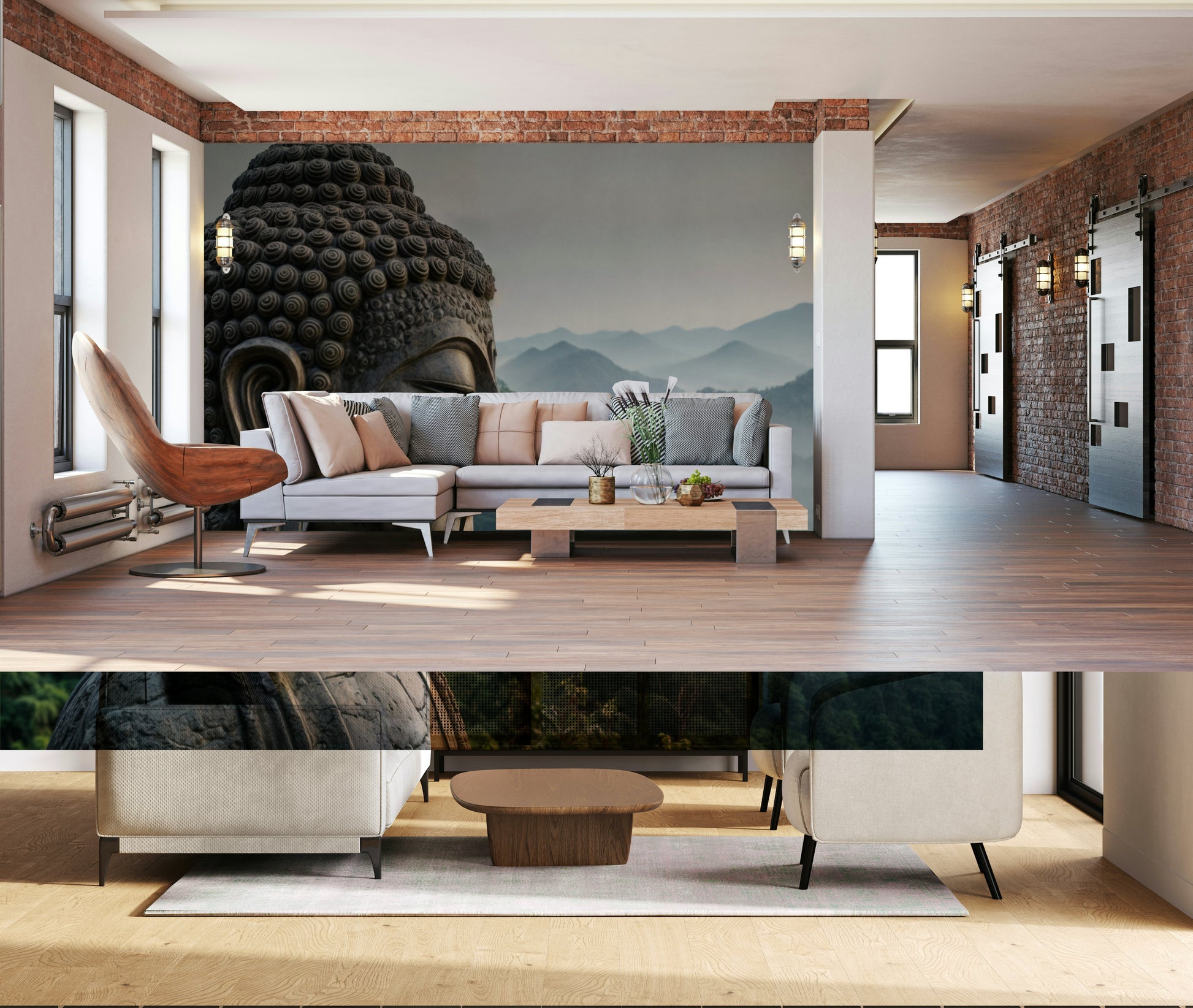 Embrace tranquility with this serene Buddha vista for your living space. Featuring a detailed statue against a backdrop of misty mountains, this wallpaper for walls creates a calming atmosphere. The gentle grey and green hues promote relaxation, while the intricate detail of the statue offers a focal point of peace. It will enhance any room with a touch of spiritual elegance. Consider it for your bedroom, meditation space, or even a home office to encourage mindfulness and calm focus. This design brings a slice of meditative landscape to your interior, infusing it with a sense of balance and harmony.