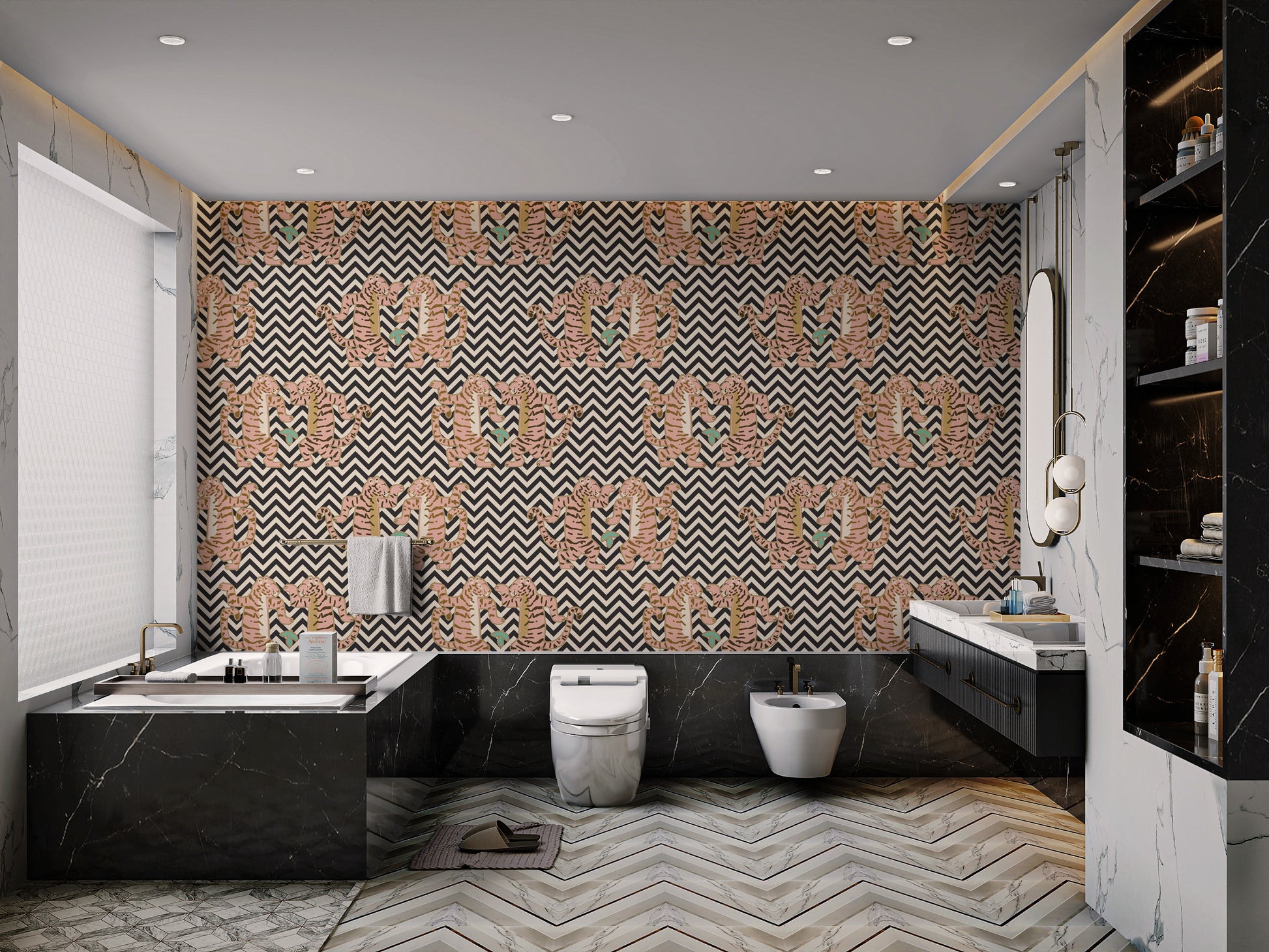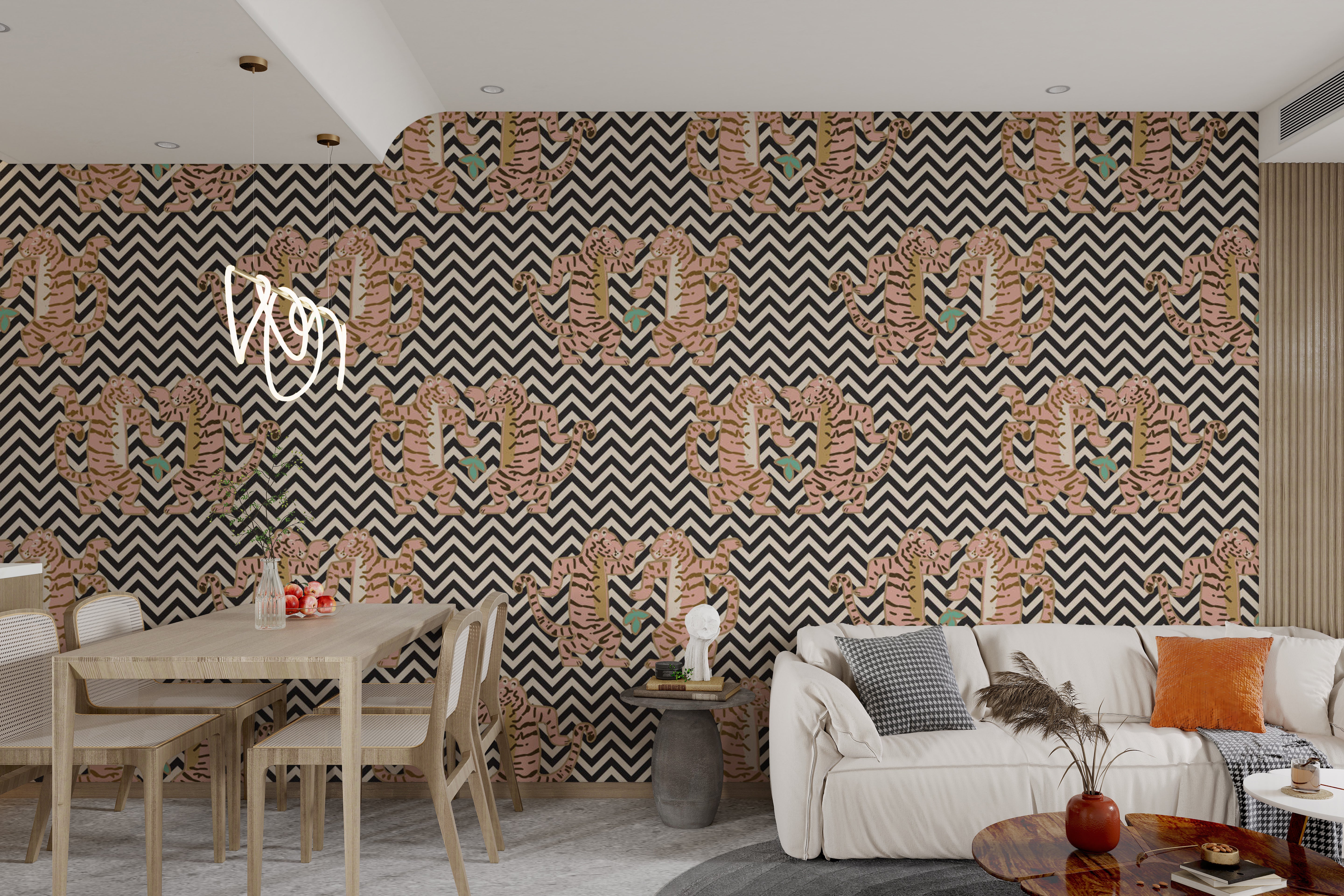 Leap into a realm where playful tigers dance across a hypnotic zigzag backdrop, infusing your surroundings with a touch of whimsy and a bold graphic punch. This wallpaper pattern is an artistic twist on tradition, merging the classic with the capricious. Imagine walls that tell a story of feline grace, clad in an array of stripes that defy monotony. Envision a corner of your home that brims with life, where these majestic creatures seem to move with an infectious rhythm. It's a celebration of pattern and wildlife, an invitation to break free from the mundane and embrace a unique visual symphony.